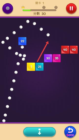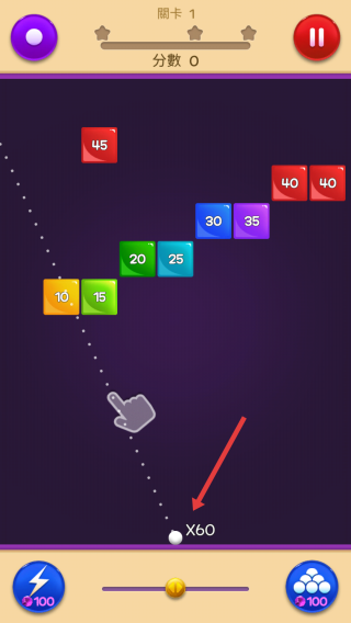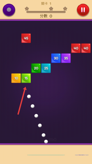 1、在關(guān)卡1,拖動調(diào)整白色彈珠(×60)的發(fā)射角度,松開后彈珠彈射,撞擊彩色方塊(標有數(shù)字,如10、15、20)。