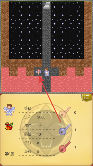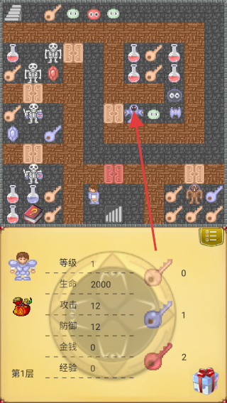 3、到達(dá)第1層后,按箭頭指示方向探索,避開或擊敗怪物,收集鑰匙、藥水等道具,提升角色屬性,逐步向上攀登魔塔,解鎖新區(qū)域,推進(jìn)游戲劇情。