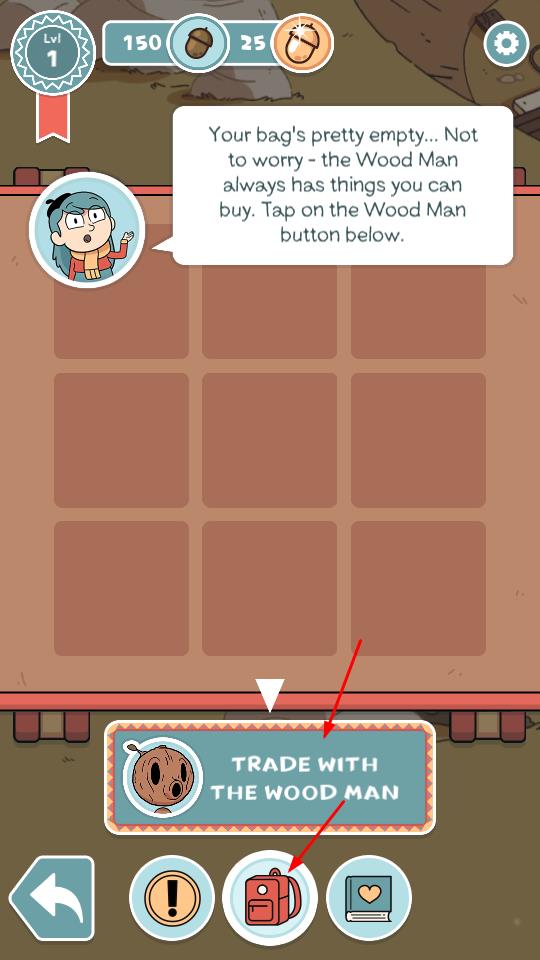 3、打開背包界面,點(diǎn)擊“TRADE WITH THE WOOD MAN”,利用橡果交易道具,助力冒險進(jìn)程。