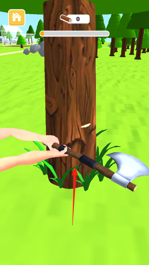 1、進入游戲后先砍樹木,用斧頭對準(zhǔn)樹干(箭頭指向),持續(xù)點擊或滑動,砍倒樹木。