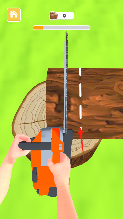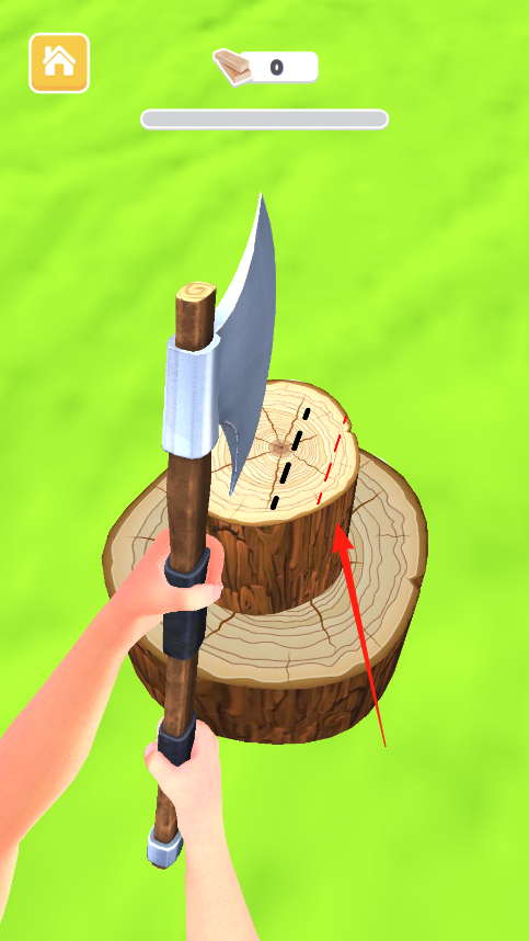 3、再用斧頭,對準(zhǔn)原木標(biāo)記線箭頭指示方向,劈砍分段,獲取木材,完成關(guān)卡,積累資源解鎖工具、場景。