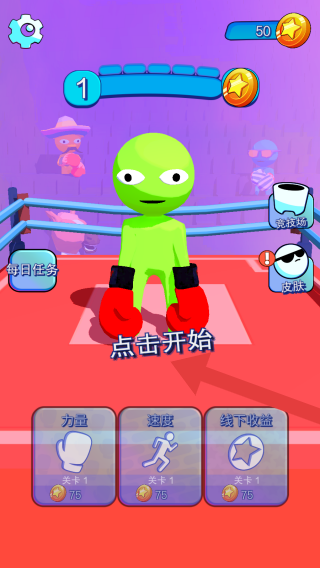1、點(diǎn)擊【點(diǎn)擊開始】按鈕,下方有“力量”“速度”“線下收益”三個養(yǎng)成模塊,需要75金幣,呈現(xiàn)開局可進(jìn)行的操作與養(yǎng)成體系。