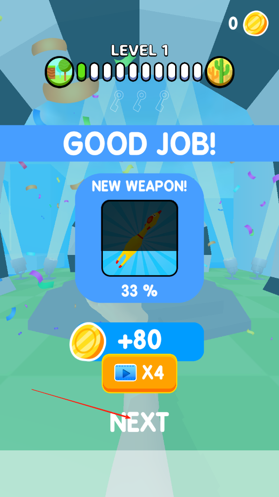 2、將所有的皮筋人擊飛后,即可到達終點,每通關(guān)一個關(guān)卡,獎勵則會增長一點進度,且也會獲得金幣的獎勵。