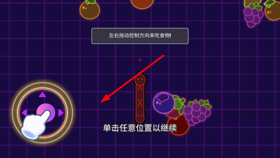 1、進玩家通過左右拖動控制方向,引導蛇去吃食物,通過左下角虛擬搖桿或點擊屏幕拖動,調(diào)整霓虹蛇方向,點擊任意位置跳過引導,開啟吞噬冒險。
