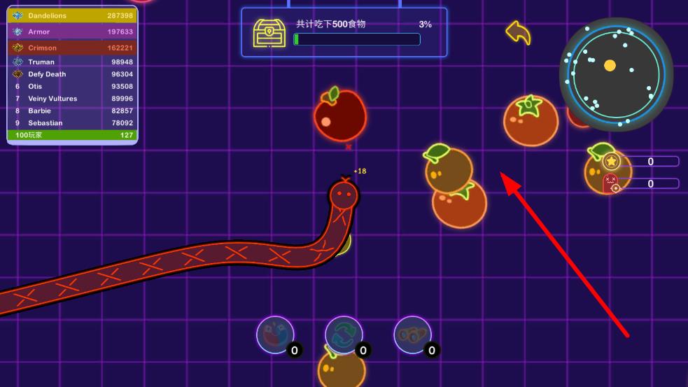 2、操控霓虹蛇在地圖移動,主動吞噬各類水果,上方顯示積累共計吃下食物的進度調(diào),同時留意避開其他玩家或危險區(qū)域,保證蛇身存活并成長。