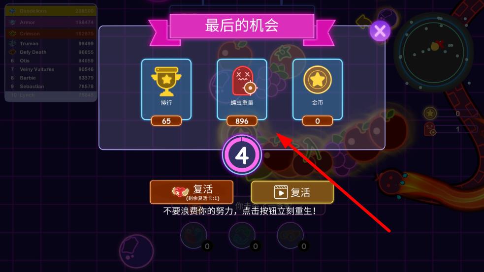 3、如果不小心失誤死亡,會彈出“最后的機會”界面,可選擇消耗復活卡或觀看廣告復活,繼續(xù)積累排行、蠕蟲重量等數(shù)據(jù);存活至結算,可依據(jù)吞噬成果解鎖獎勵。