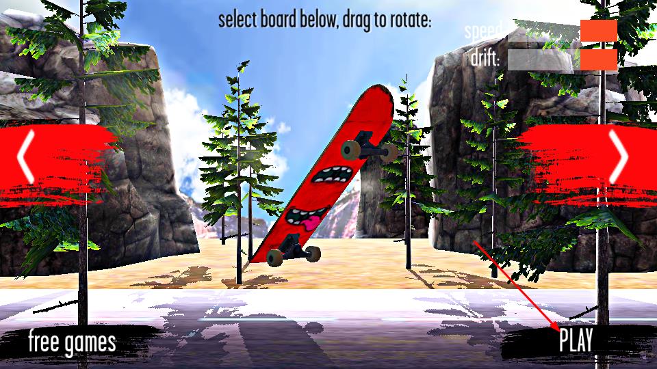 1、在選板界面按需選擇滑板,拖動(dòng)可旋轉(zhuǎn)查看點(diǎn)擊PLAY進(jìn)入競(jìng)速賽道,開(kāi)啟滑板挑戰(zhàn)。