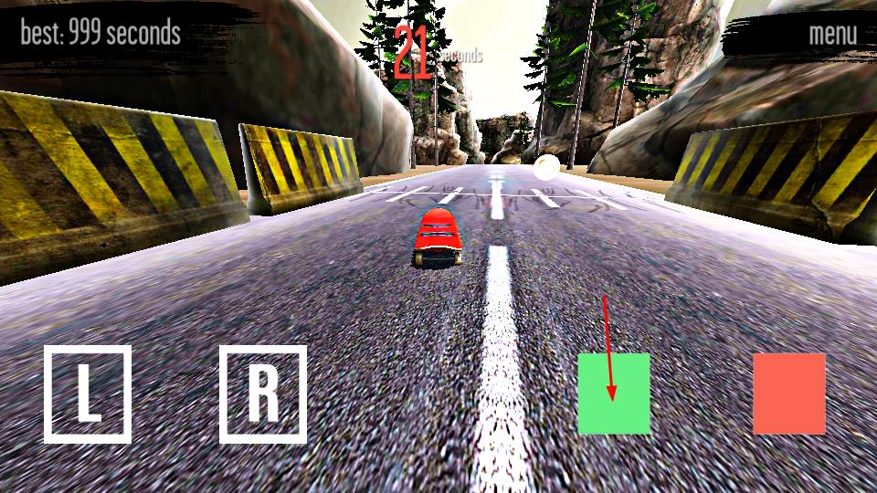 2、進(jìn)入賽道后,利用界面L、R按鍵控制方向,綠色按鍵直行加速、紅色按鍵為后退、躲避障礙,沿道路滑行。