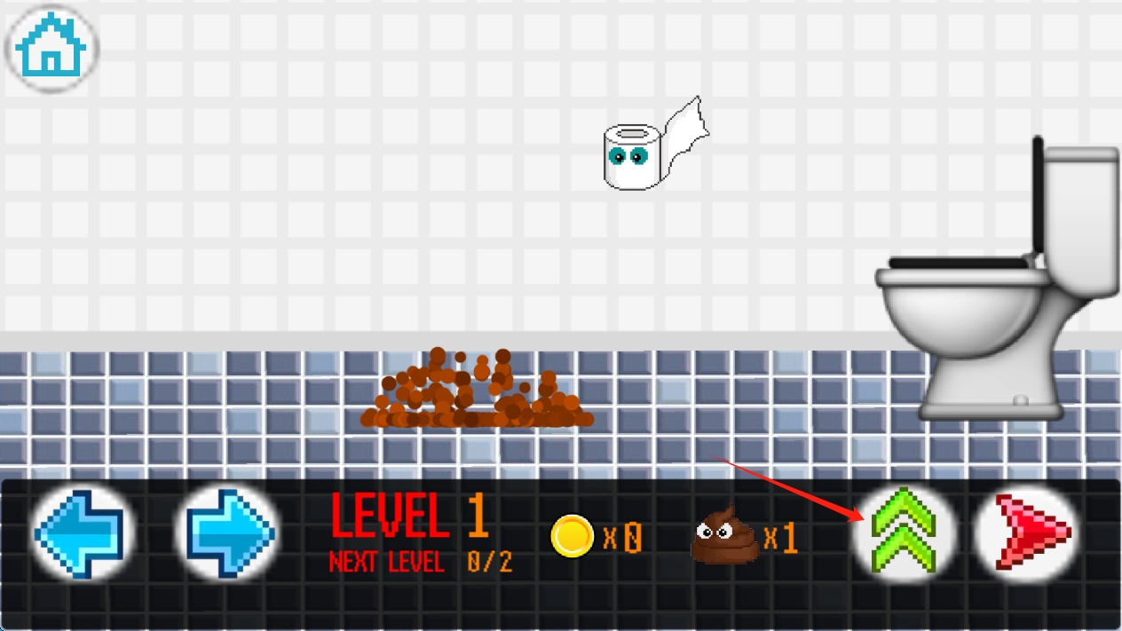3、遇到糞便障礙,點(diǎn)擊綠色跳躍鍵,讓衛(wèi)生紙?zhí)^(guò),繼續(xù)前往馬桶,點(diǎn)擊按鈕跳躍。