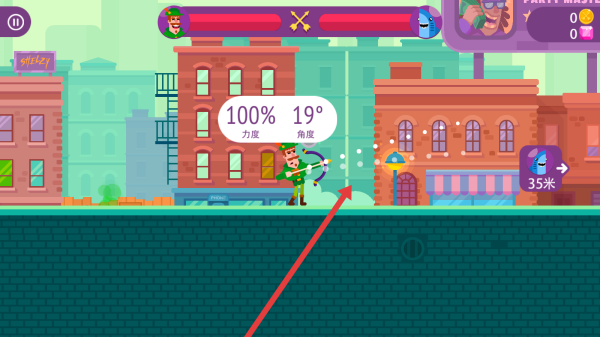 3、戰(zhàn)斗時可以滑動屏幕調(diào)整力度100%、角度19°,發(fā)射弓箭,精準(zhǔn)打擊對手擊敗他取得勝利。