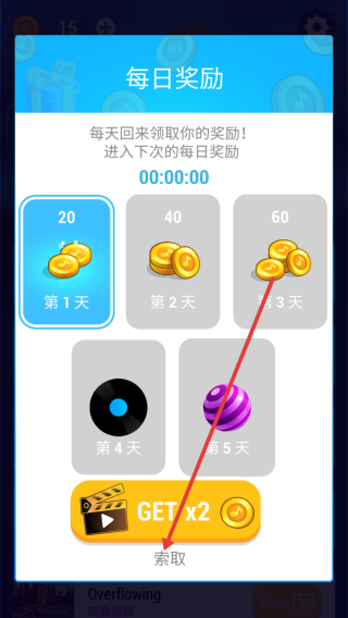 1、進入每日獎勵頁,點擊索取,領取第1天20金幣,或看廣告雙倍獲取,積累游戲資源。