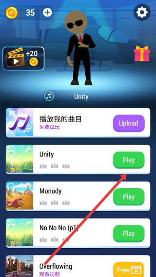 2、在曲目選擇界面,選擇Unity點擊旁邊Play按鈕,選定音樂,進入跑酷模式,跟隨節(jié)奏挑戰(zhàn)。