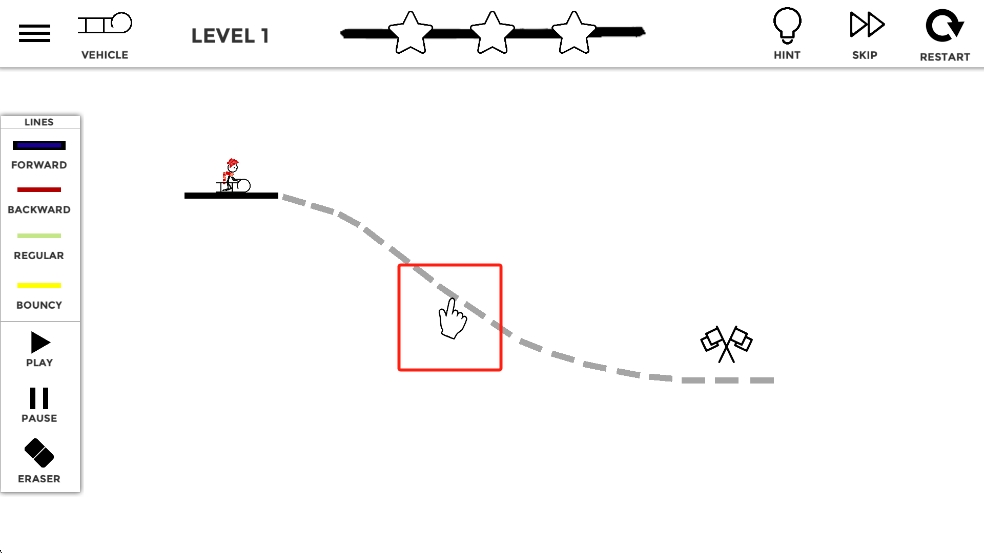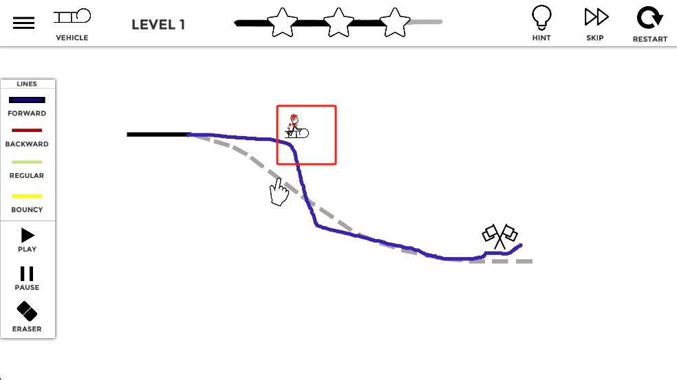 1、繪制線條賽車:在關(guān)卡起點(diǎn)的繪畫區(qū)域,用手指畫出任意線條當(dāng)作賽車,線條的形狀決定賽車的行駛路徑,畫完后松開(kāi)手指,賽車便會(huì)自動(dòng)向前行駛。