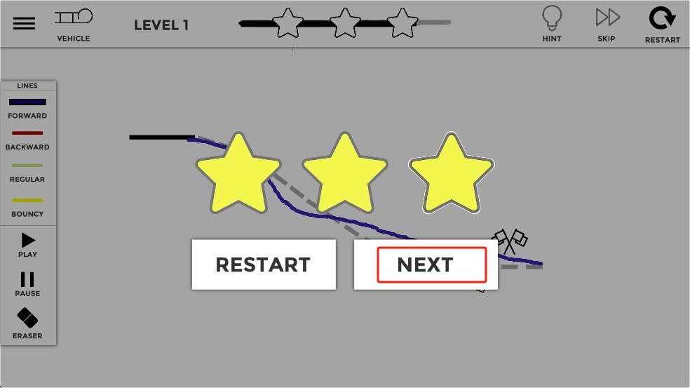 3、關(guān)卡結(jié)束界面,若已收集星星達(dá)成條件,點(diǎn)擊NEXT按鈕即可進(jìn)入下一關(guān),要是想重玩優(yōu)化路線也可以點(diǎn)RESTART按鈕。
