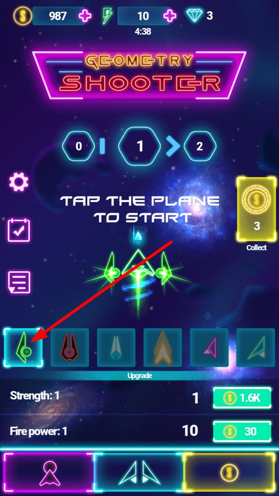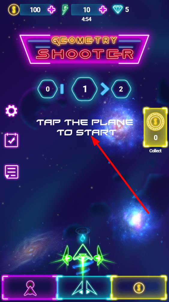 1、選擇戰(zhàn)機(jī),進(jìn)入第一關(guān)戰(zhàn)場(chǎng),戰(zhàn)機(jī)自動(dòng)發(fā)射子彈,準(zhǔn)備迎擊首批幾何敵機(jī)。