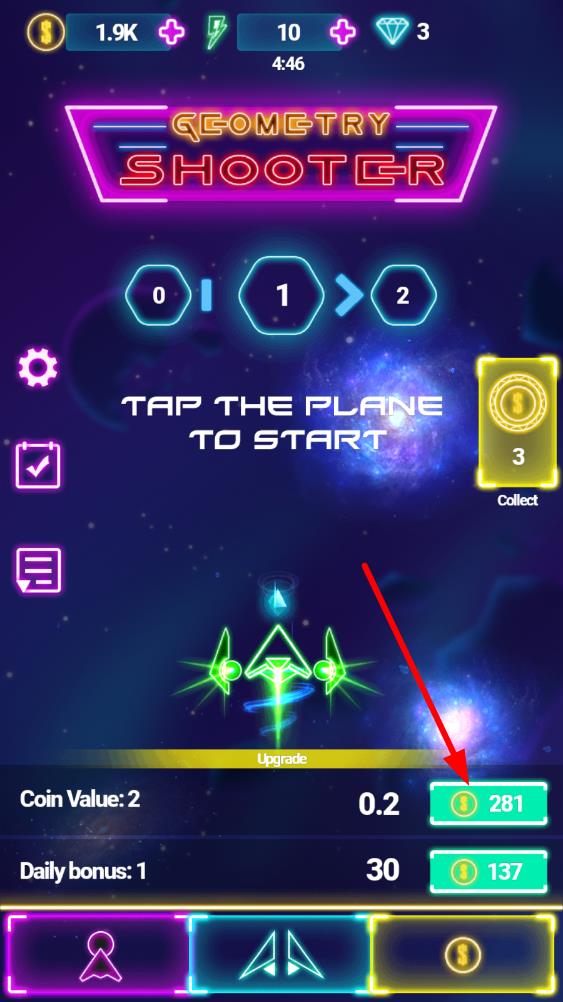 2、需躲避密集彈幕,鎖定大型幾何敵機(jī)優(yōu)先攻擊,同時(shí)收集掉落的補(bǔ)給道具。