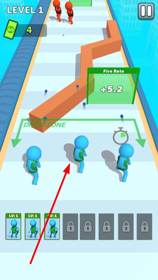 2、收集“Fire Rate+5.2”等增益道具,提升士兵戰(zhàn)力,搭配不同士兵卡牌,組成小隊,利用合成升級強化屬性,應對橙色敵人。