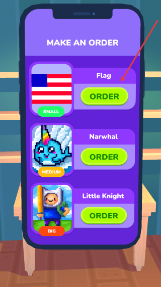 1、點擊桌上手機進入訂單界面,選美國國旗圖案的Flag,點擊ORDER完成下單流程。