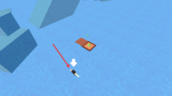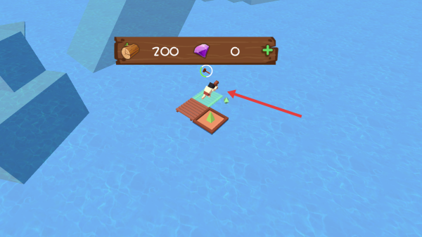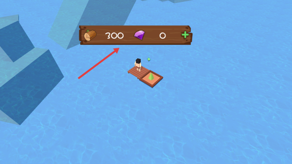 1、操控角色游向木筏,靠近后登上,熟悉初始木筏空間與資源顯示木材、紫色礦石計數(shù)。