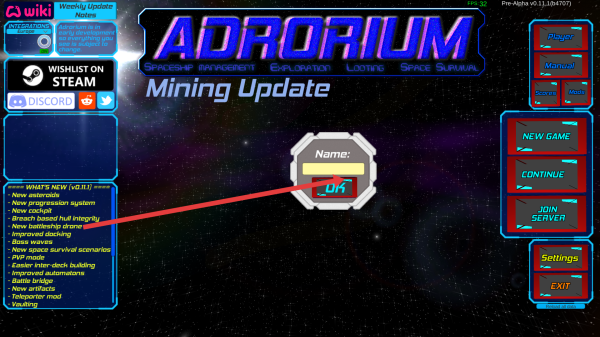 1、開(kāi)始游玩,主界面選項(xiàng)NEW GAME,取個(gè)自己喜歡的名稱,點(diǎn)OK,創(chuàng)建角色開(kāi)啟太空冒險(xiǎn)。