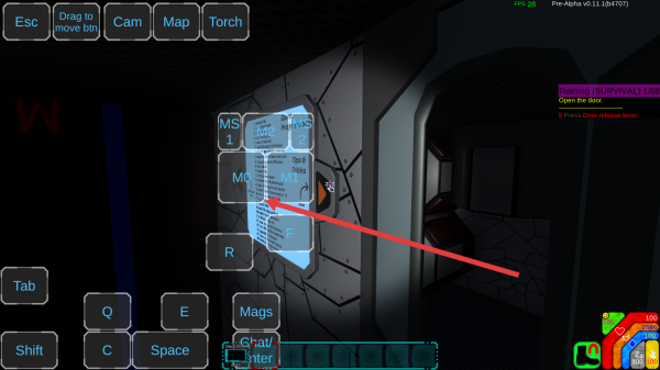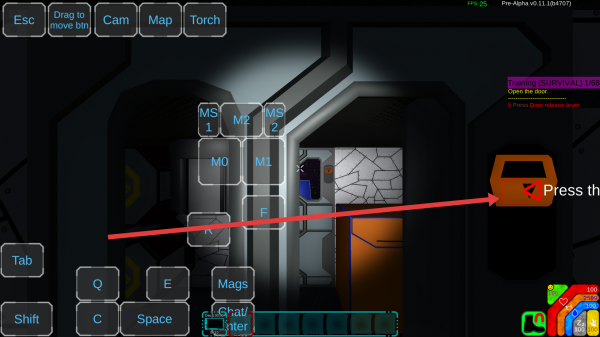 2、進(jìn)入飛船,按任務(wù)指引如Press Door release lever,操作界面按鈕對(duì)應(yīng)按鍵,解鎖艙門(mén)、探索區(qū)域。