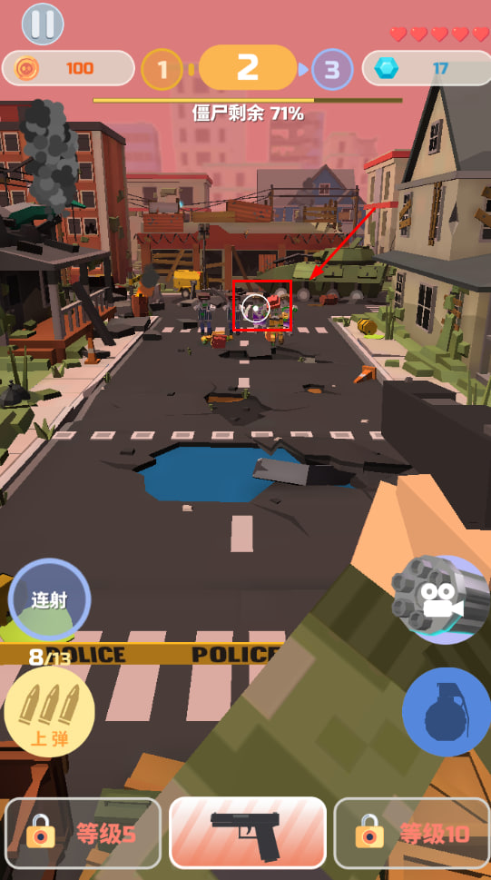 2、瞄準(zhǔn)圖標(biāo)對(duì)準(zhǔn)僵尸目標(biāo),點(diǎn)擊鼠標(biāo)左鍵開始發(fā)射。