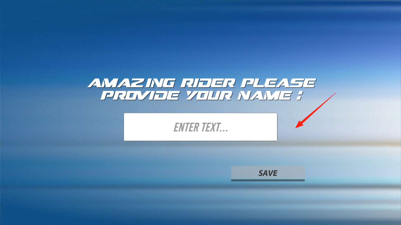 1、進(jìn)入游戲初始界面,顯示AMAZING RIDER PLEASE PROVIDE YOUR NAME,玩家需在輸入框錄入姓名,完成后點(diǎn)擊 SAVE保存,這一步是為騎手創(chuàng)建專屬身份。