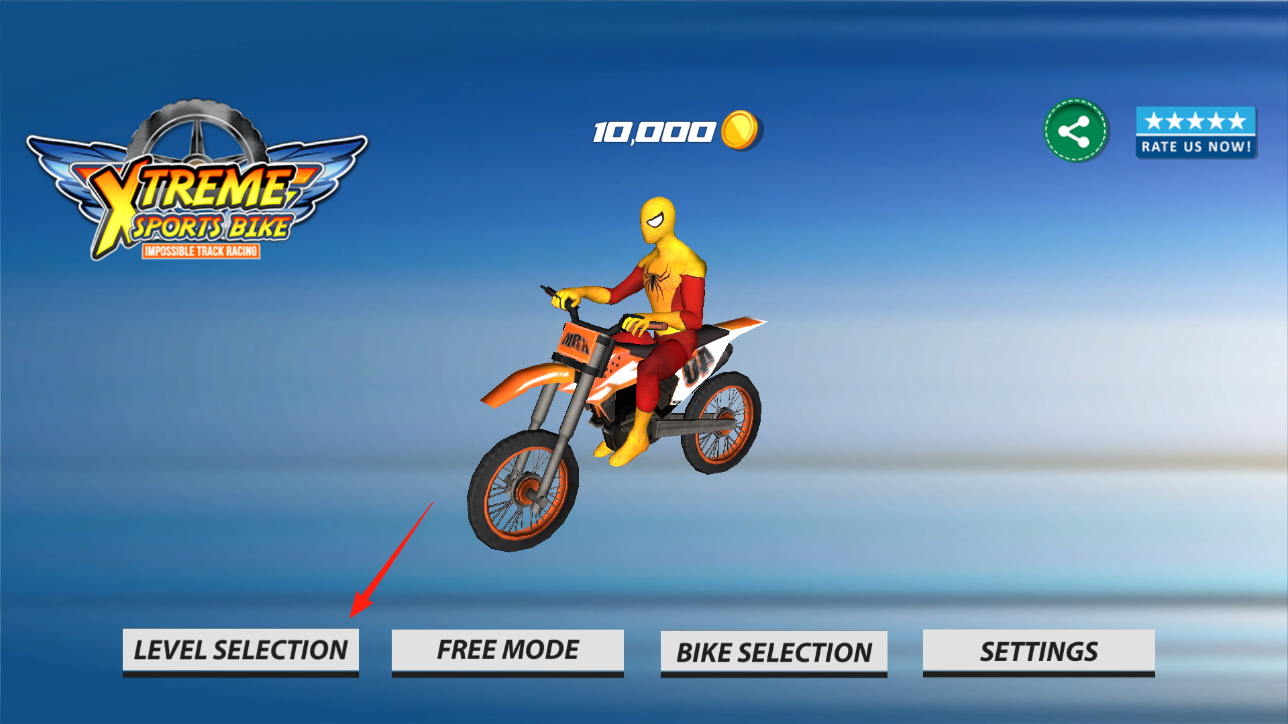 2、來(lái)到Xtreme Sports Bike主界面,畫面呈現(xiàn)角色騎摩托車的形象,界面有LEVEL SELECTION,F(xiàn)REE MODE等選項(xiàng),點(diǎn)擊LEVEL SELECTION,可進(jìn)入關(guān)卡選擇頁(yè)面。