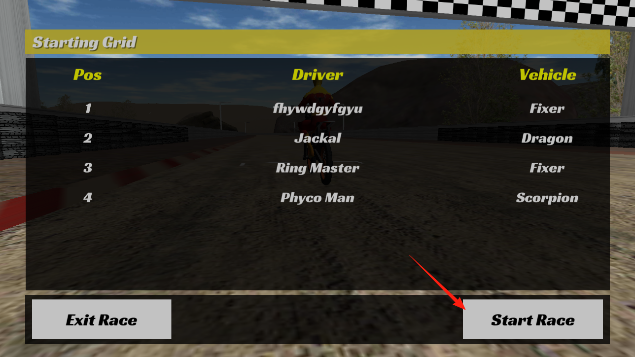 3、進(jìn)入Starting Grid賽前準(zhǔn)備界面,顯示起跑位、車手及車輛信息,確認(rèn)參賽信息后,點(diǎn)擊Start Race,摩托車比賽正式開始,玩家需操控車輛在賽道行駛,應(yīng)對(duì)彎道、坡道等地形。