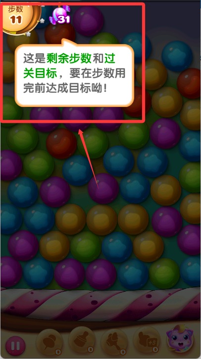 4、右上角會顯示剩余步數(shù)和過關(guān)目標(biāo),我們需要在步數(shù)用完前達(dá)到目標(biāo)。