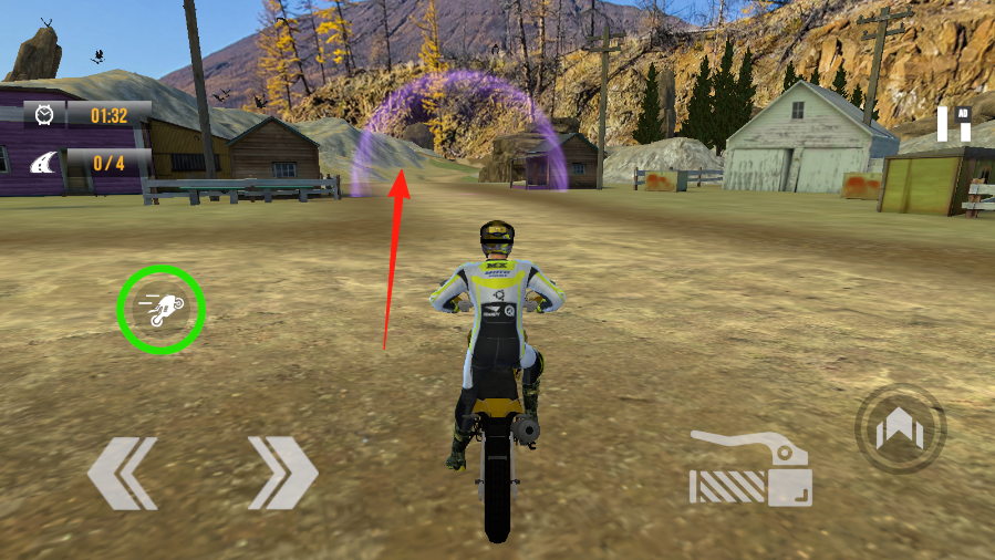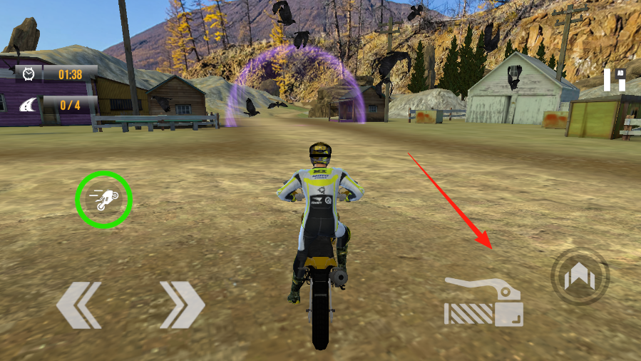 2、進入游戲場景,點擊右側(cè)剎車油門相關(guān)按鈕箭頭指向,操控摩托在荒野地形起步行駛。