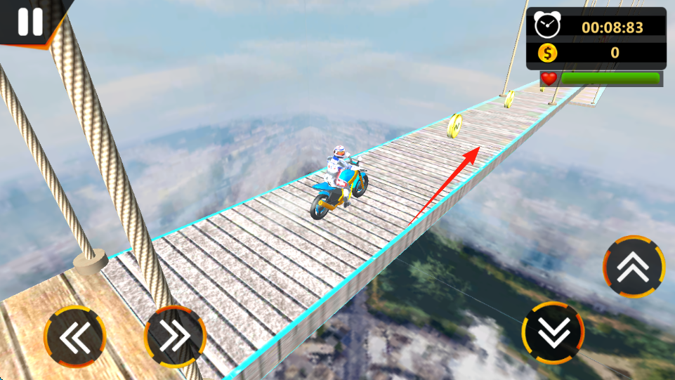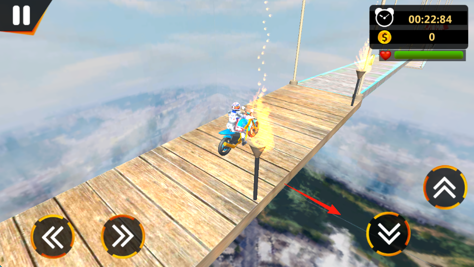 1、在高空木橋賽道,點擊右側(cè)剎車按鈕箭頭指向,調(diào)整摩托速度,保持平衡通過火焰障礙。