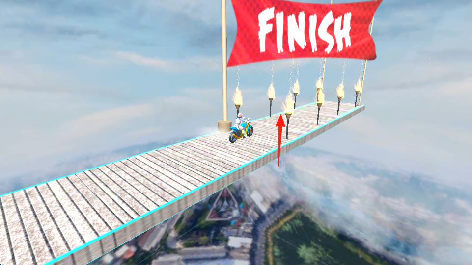 3、向FINISH終點旗幟前進,按箭頭指向,保持速度和方向,沖過終點,完成關(guān)卡。