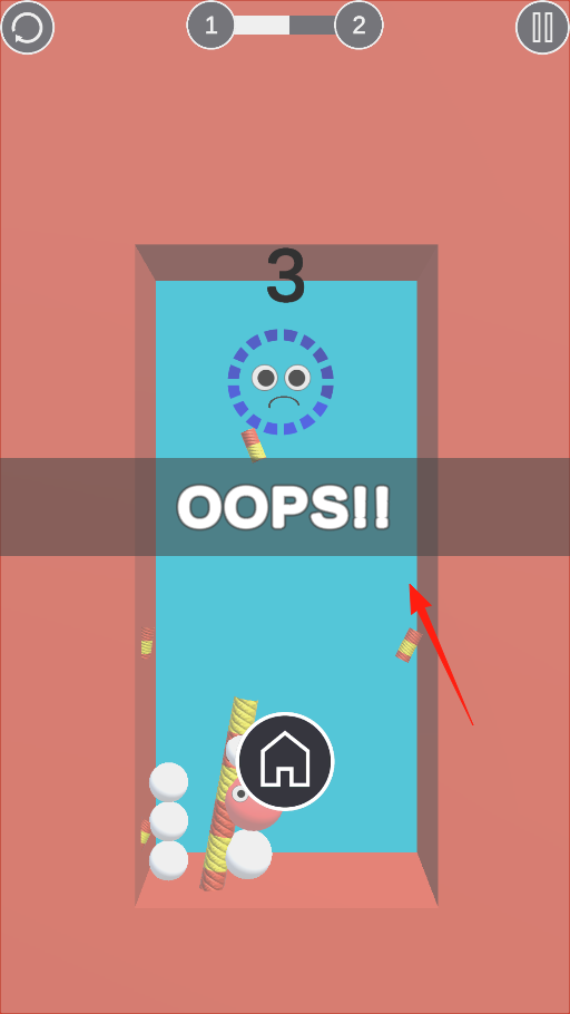 3、游戲失敗場景中,角色因角度調(diào)整不當未通過通道,點擊房子圖標返回主頁,或重新嘗試調(diào)整角度,借助失敗反饋機制,總結(jié)角度調(diào)整問題,重新規(guī)劃拉伸方式。