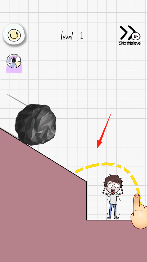 2、在第1關(guān)場景,看到滾落的石頭與被困角色,用手指繪制線條,在角色上方構(gòu)建防護(hù)區(qū)域,阻擋石頭傷害,利用繪圖機(jī)制,自由創(chuàng)作防護(hù)形狀,嘗試保護(hù)角色。