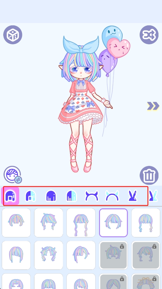 1、開(kāi)局進(jìn)入角色裝扮界面,點(diǎn)擊下方頭飾欄的圖標(biāo),為角色更換藍(lán)色系蝴蝶結(jié)樣式的頭飾,搭配彩色發(fā)型,塑造獨(dú)特造型。