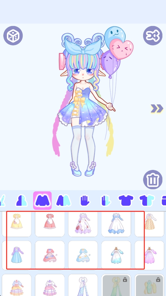2、切換到服裝分類(lèi)欄,選取藍(lán)色漸變且?guī)в悬S色蝴蝶結(jié)的裙子,替換原有粉裙,搭配同色系鞋襪,調(diào)整角色穿搭風(fēng)格。