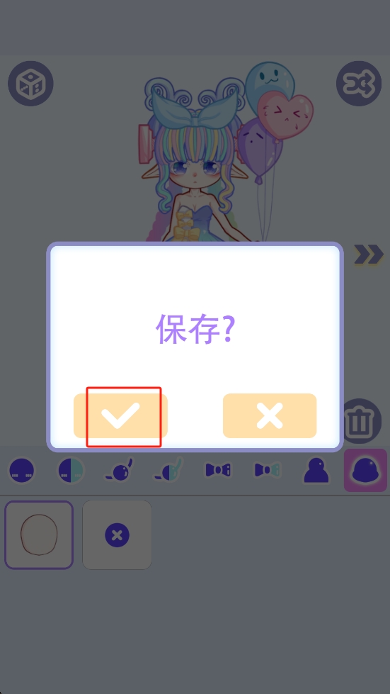 3、搭配完成后界面會(huì)生成360°旋轉(zhuǎn)的形象展示,點(diǎn)擊左側(cè)帶對(duì)勾的黃色按鈕,即可保存當(dāng)前角色的裝扮設(shè)計(jì)。