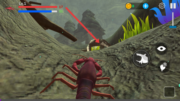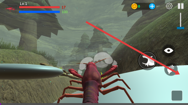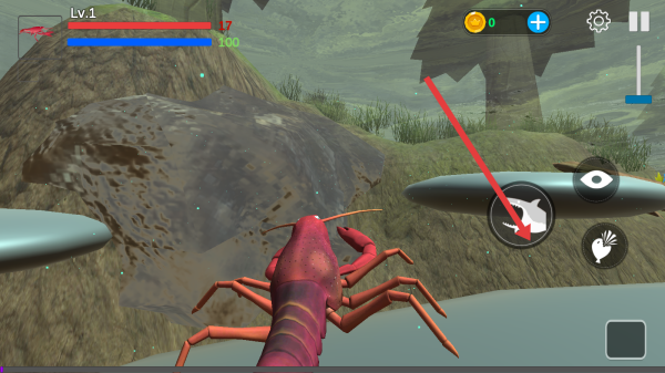 1、進(jìn)入海底場(chǎng)景,操控小龍蝦在海底游動(dòng),避開(kāi)障礙物,利用右下角技能按鈕,鯊魚(yú)圖標(biāo)等來(lái)應(yīng)對(duì)危險(xiǎn)。
