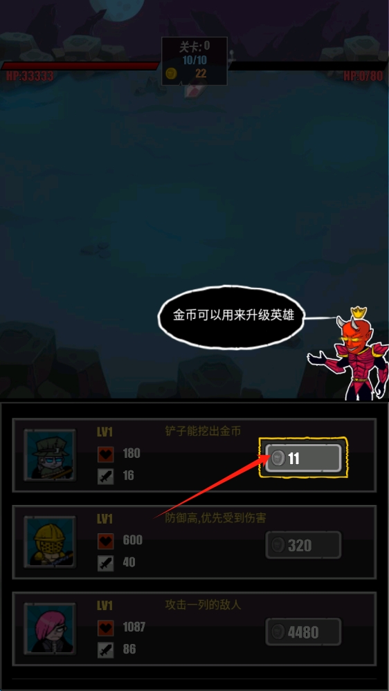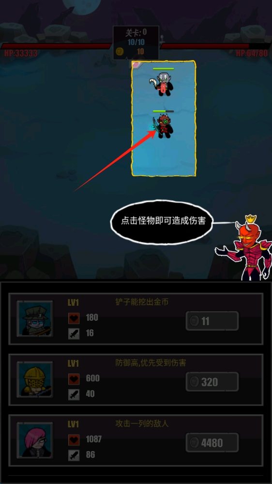 1、進(jìn)入關(guān)卡,點(diǎn)擊怪物,利用英雄攻擊,積累金幣,注意怪物血量與己方英雄生存,點(diǎn)擊攻擊敵人。