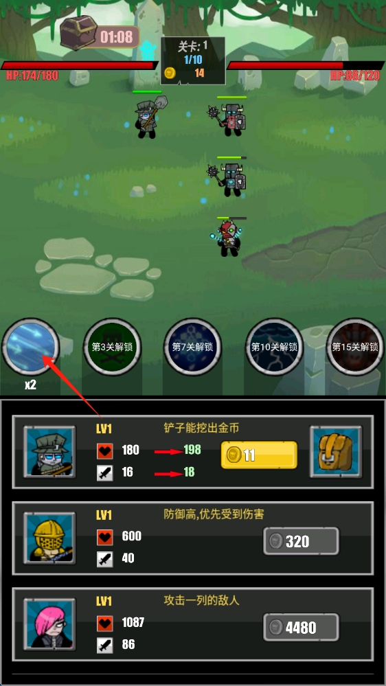 2、戰(zhàn)斗結(jié)束,用獲得金幣升級(jí)英雄,優(yōu)先提升輸出或防御關(guān)鍵英雄,增強(qiáng)戰(zhàn)力,點(diǎn)擊升級(jí)英雄。