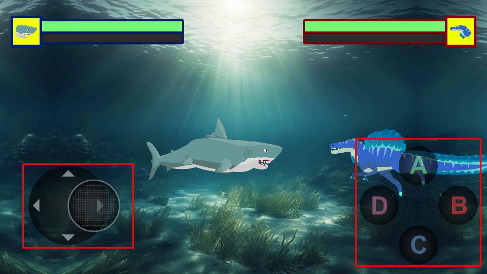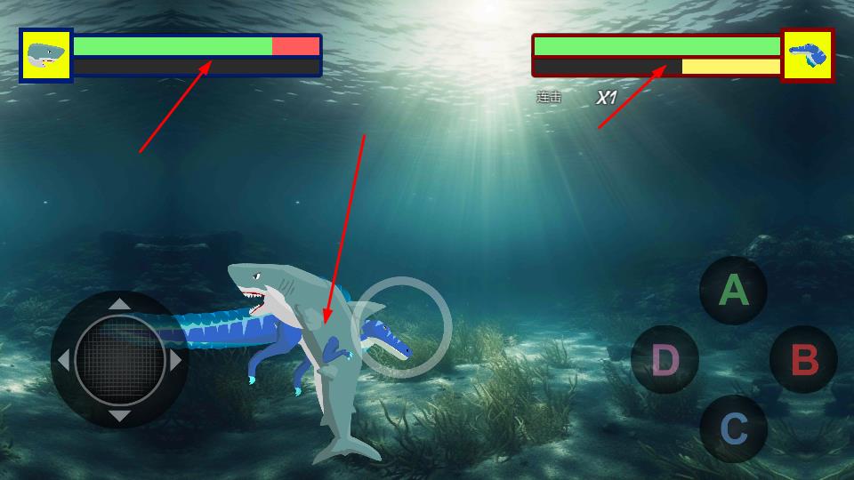 2、左側(cè)方向輪盤控制移動(dòng),右側(cè)A、B、C、D按鍵觸發(fā)攻擊,靈活操作躲避海怪進(jìn)攻,找準(zhǔn)時(shí)機(jī)反擊。