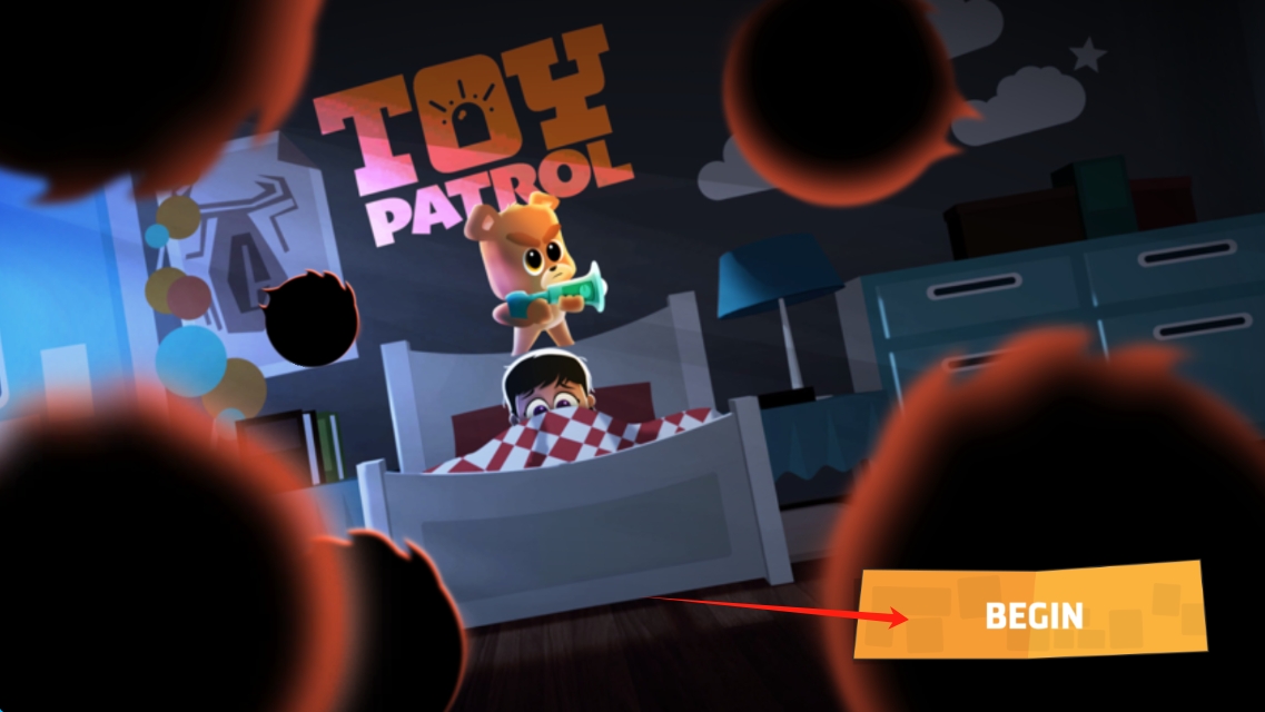1、進(jìn)入Toy Patrol,點(diǎn)擊BEGIN,操控玩具熊,開啟房間巡邏冒險(xiǎn),點(diǎn)擊按鈕開始游戲。