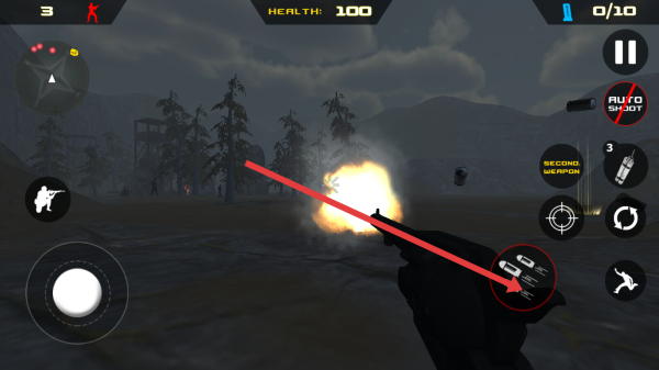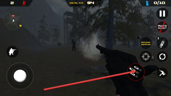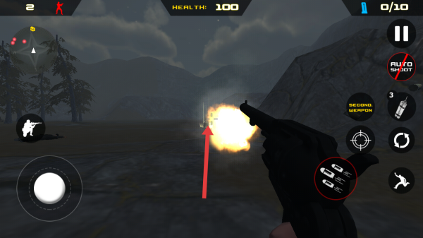 1、進(jìn)入射擊場(chǎng)面,用戶操控虛擬搖桿移動(dòng),借樹木、地形作掩護(hù),遇敵點(diǎn)擊射擊按鈕或開自動(dòng)射擊。