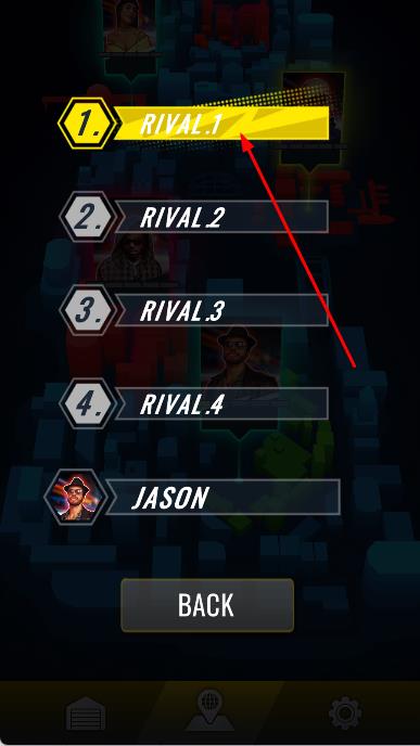 1、在對(duì)手選擇界面,點(diǎn)擊RIVAL1,進(jìn)入停車場(chǎng)賽道,藍(lán)色與白色賽車通過紅繩連接拔河。