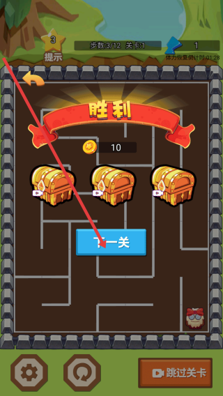 3、成功到寶箱領(lǐng)金幣、寶箱獎勵,點下一關(guān)進新迷宮,準確控制好步數(shù),推進關(guān)卡進度。