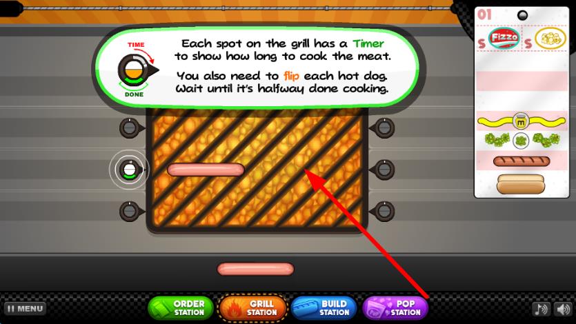 1、進(jìn)入游戲后熟悉熱狗制作流程,從烤面包、加香腸到搭配醬料和配菜,按照首位顧客的訂單要求,完成第一份熱狗的制作并交付。