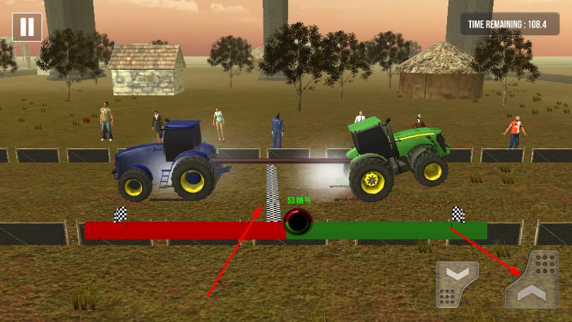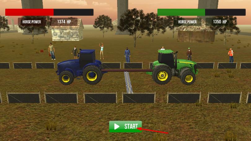 2、進(jìn)入拔河對(duì)戰(zhàn),與藍(lán)色拖拉機(jī)通過(guò)橫桿連接,點(diǎn)擊START開(kāi)始,用虛擬按鍵控制拖拉機(jī)前進(jìn)。