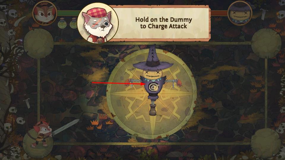 3、游戲戰(zhàn)斗中,依據(jù)提示Hold on the Dummy to Charge Attack,長(zhǎng)按稻草人dummy積攢攻擊,提升戰(zhàn)斗能力。