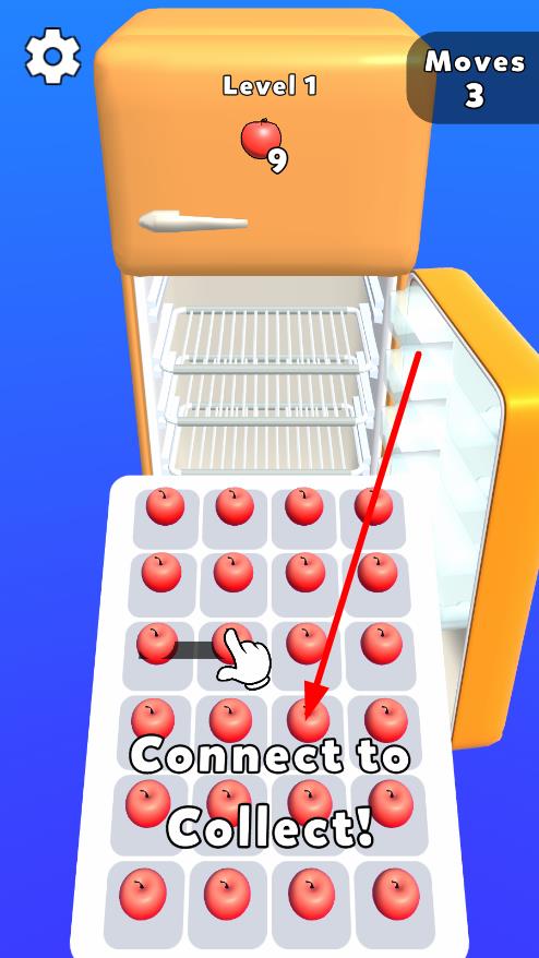 1、進入Level1,查看冰箱上需收集的蘋果數(shù)量9個,依據(jù)提示“Connect to Collect!”,點擊面板蘋果開始連線消除,消耗步數(shù)Moves推進。